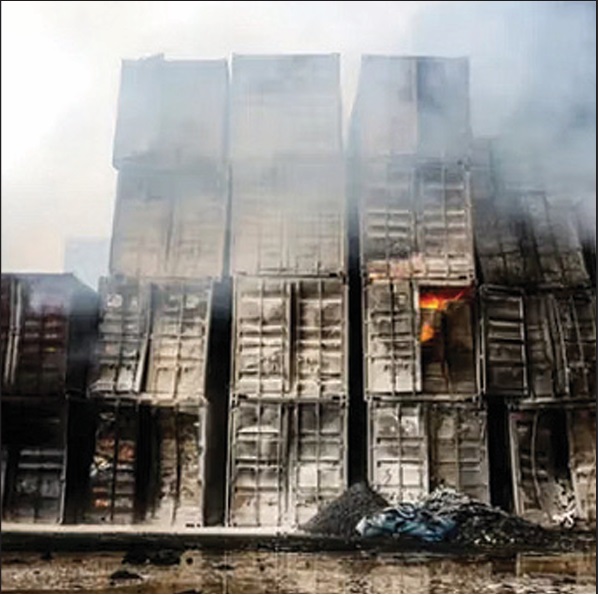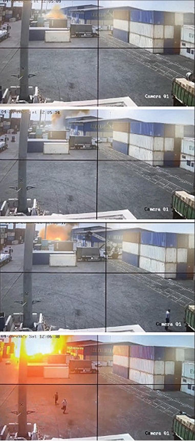 Video from a security camera placed on the roof of a building in the port showed flames coming from a stacked container that no one on the ground seemed to notice right away. The first flames were visible at 12:05:08 p.m.—67 seconds later, the flames soared high above the container. Twenty-four seconds after that, a huge blast erupted, and the video stopped.